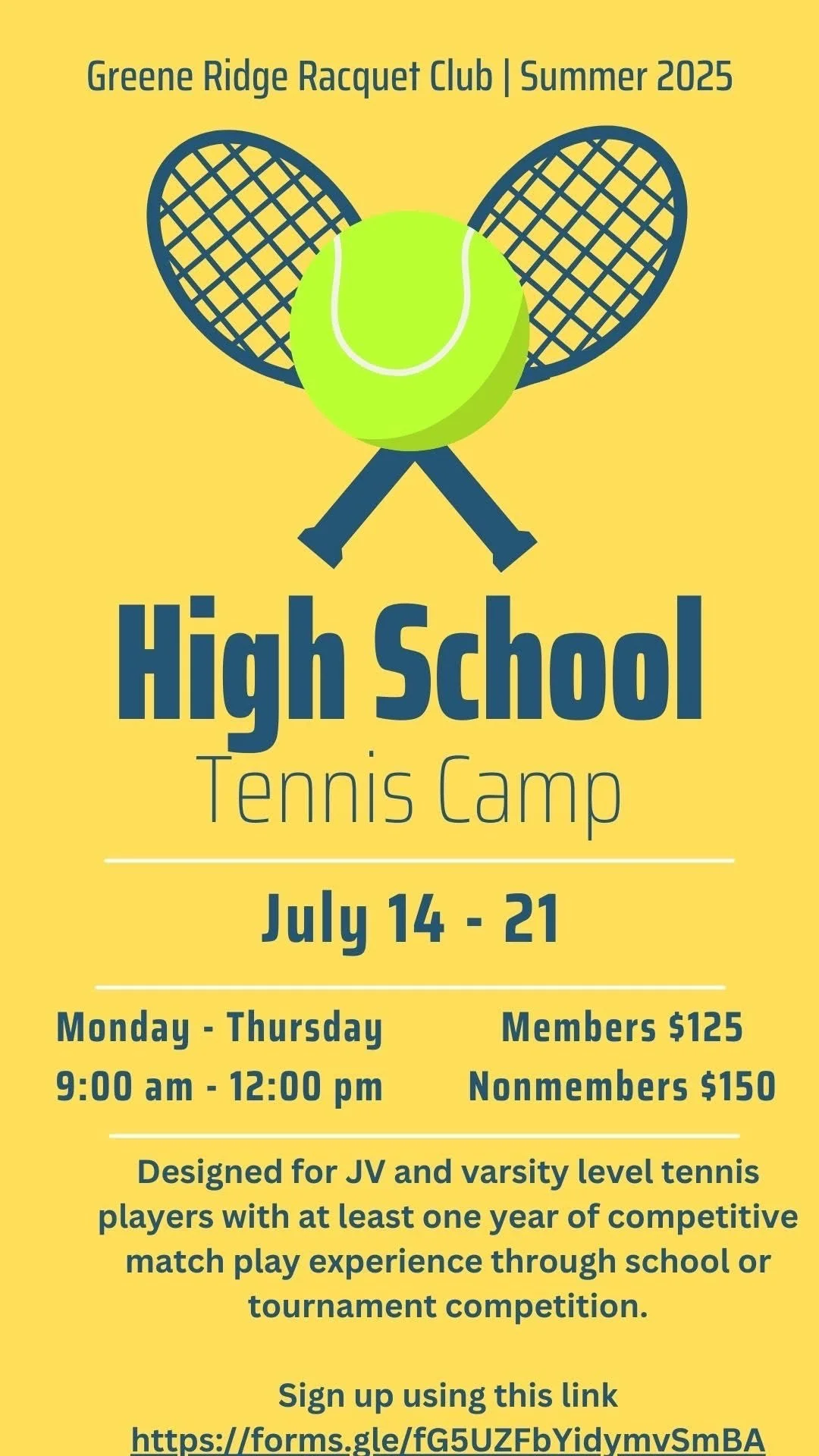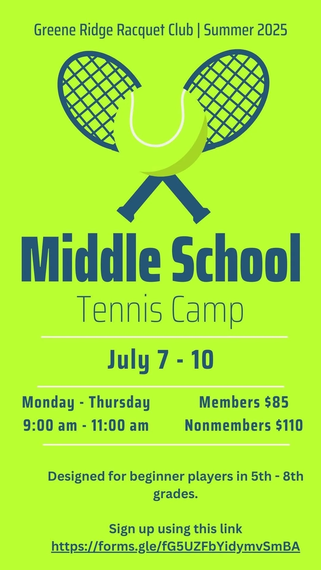 Serve up an unforgettable summer at Greene Ridge’s Youth Tennis Camps! Designed for players of all skill levels, our camps provide a fun and supportive environment where kids can rally with friends, improve their skills, and gain confidence on the court. Under the expert guidance of our tennis instructors, young players will learn the fundamentals of tennis, while also developing their game strategies. Whether they’re picking up a racket for the first time or perfecting their serve, our youth camps are the perfect way to keep your kids active and engaged.